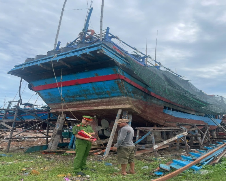 Cán bộ Công an phường Phú Yên hướng dẫn cách sử dụng bình chữa cháy cho chủ tàu khi tàu đang neo đậu, sửa chữa tại Cảng cá Đông tác