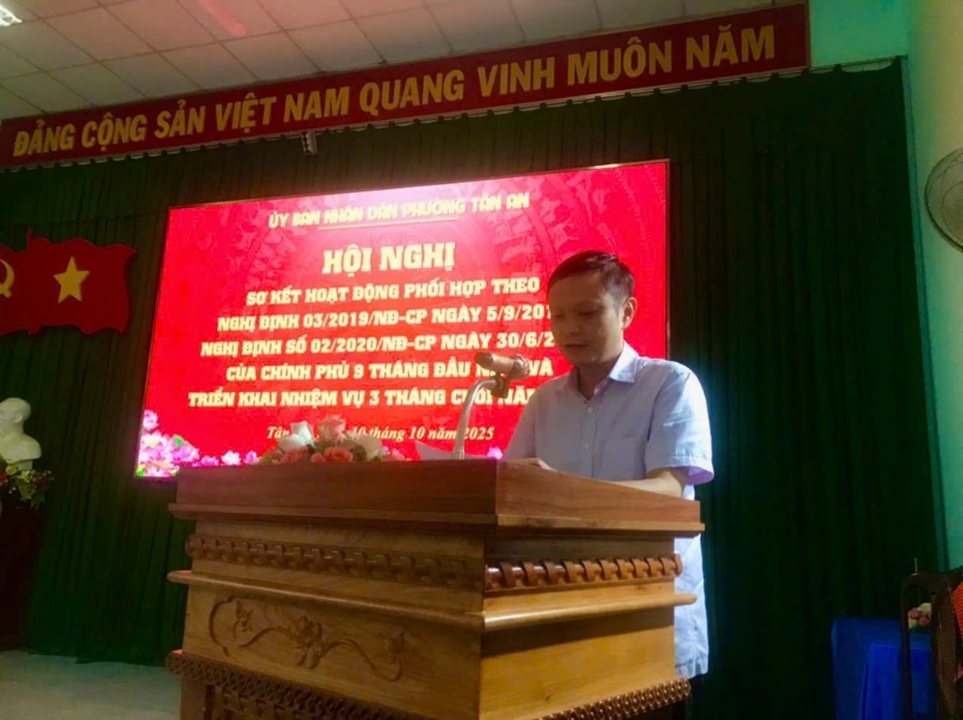 Chiều ngày 10/10/2025, tại trụ sở Ban Chỉ huy Quân sự phường Tân An, Ủy ban nhân dân phường Tân An tổ chức Hội nghị sơ kết đánh giá kết quả triển khai các hoạt động phối hợp theo Nghị định số 03/2019/NĐ-CP ngày 05/9/2019 và Nghị định số 02/2020/NĐ-CP ngày 30/6/2020 của Chính phủ.