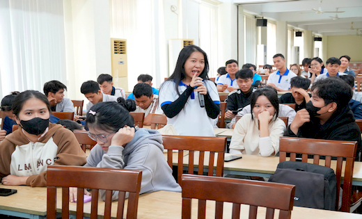 Phần giao lưu hỏi – đáp trắc nghiệm được tổ chức sôi nổi, thu hút sự tham gia nhiệt tình của sinh viên. Các câu hỏi xoay quanh quy định pháp luật, dấu hiệu nhận biết và cách xử lý khi phát hiện hành vi nghi vấn mua bán người đã giúp người nghe củng cố kiến thức và nâng cao ý thức cảnh giác trong đời sống.
