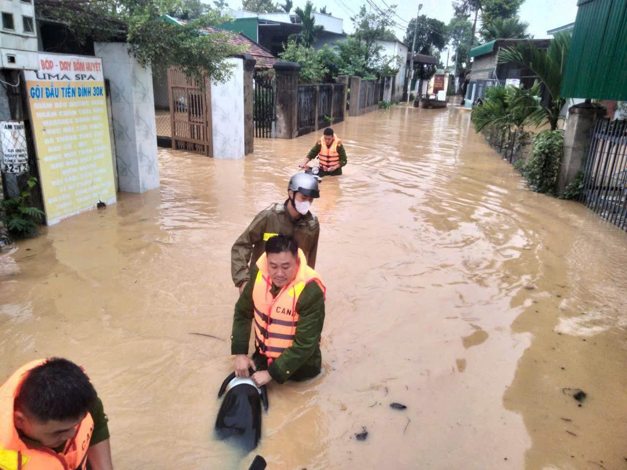 Tại các xã Hòa Thịnh, Hòa Mỹ, Phú Hoà 1, Phú Hoà 2, lực lượng cứu hộ "căng mình" chạy đua với thời gian hỗ trợ người dân di chuyển đến nơi an toàn, kịp thời đưa nhu yếu phẩm để hỗ trợ người dân. Tại các xã Đức Bình, Sông Hinh, Sơn Thành, Công an xã cũng phối hợp thành lập tổ Công tác sử dụng ca nô cùng trang thiết bị, phương tiện, mang theo một số nhu yếu phẩm cần thiết cùng tham gia tiếp ứng. Nhiều khu vực, phương tiện cứu hộ không thể tiếp cận, lực lượng cứu hộ đã phải căng dây, kết nối đội hình, lội nước len lỏi vào các ngõ sâu, tiếp cận từng nhà dân, đưa người già, trẻ nhỏ, phụ nữ mang thai lên ca nô an toàn, từng túi đồ, từng vật dụng thiết yếu đã được lực lượng Công an giúp người dân đưa đến nơi an toàn.