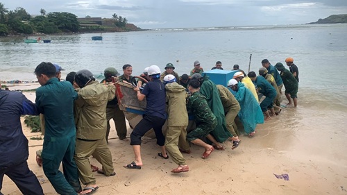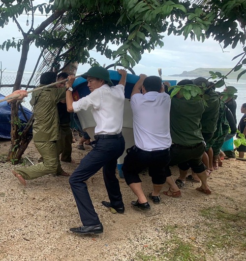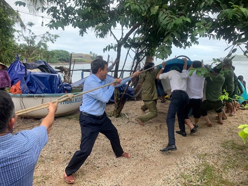 Lãnh đạo UBND xã Tuy An Nam cùng lực lượng Công an xã hổ trợ người dân di chuyển tàu thuyền đến khu vực an toàn.