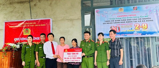 Tiếp nối hành trình, đơn vị phối hợp với Ngân hàng Agribank chi nhánh Đắk Lắk, chính quyền và Công an xã Ea Bung tổ chức chương trình “Thắp sáng cho cuộc sống ấm no”: Hỗ trợ 02 con bò sinh sản trị giá 20 triệu đồng cho 02 hộ nghèo, tặng hơn 300 hộp thuốc, thuốc bổ trị giá 12 triệu đồng và nhiều quần áo do CBCS trong đơn vị quyên góp cho nhân dân xã Ea Bung. Đây là nguồn sinh kế thiết thực, thể hiện tinh thần “tương thân tương ái, lá lành đùm lá rách”, góp phần giúp các hộ gia đình có thêm điều kiện phát triển kinh tế, từng bước ổn định cuộc sống.