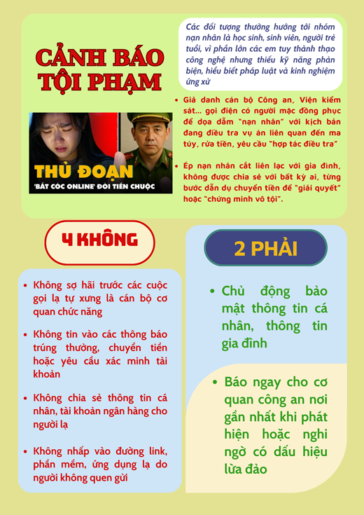 Trước thủ đoạn ngày càng tinh vi, lực lượng công an khuyến cáo người dân cần nâng cao cảnh giác, ghi nhớ nguyên tắc “4 Không, 2 Phải”: Không sợ hãi trước các cuộc gọi lạ tự xưng là cán bộ cơ quan chức năng; không tin vào các thông báo trúng thưởng, chuyển tiền hoặc yêu cầu xác minh tài khoản; không chia sẻ thông tin cá nhân, tài khoản ngân hàng cho người lạ; không nhấp vào đường link, phần mềm, ứng dụng lạ do người không quen gửi. Phải chủ động bảo mật thông tin cá nhân, thông tin gia đình; phải báo ngay cho cơ quan công an nơi gần nhất khi phát hiện hoặc nghi ngờ có dấu hiệu lừa đảo.