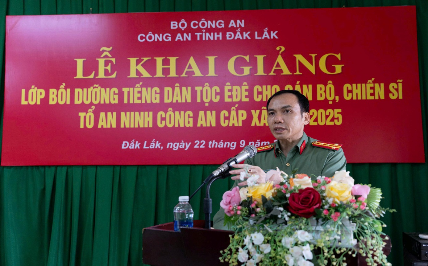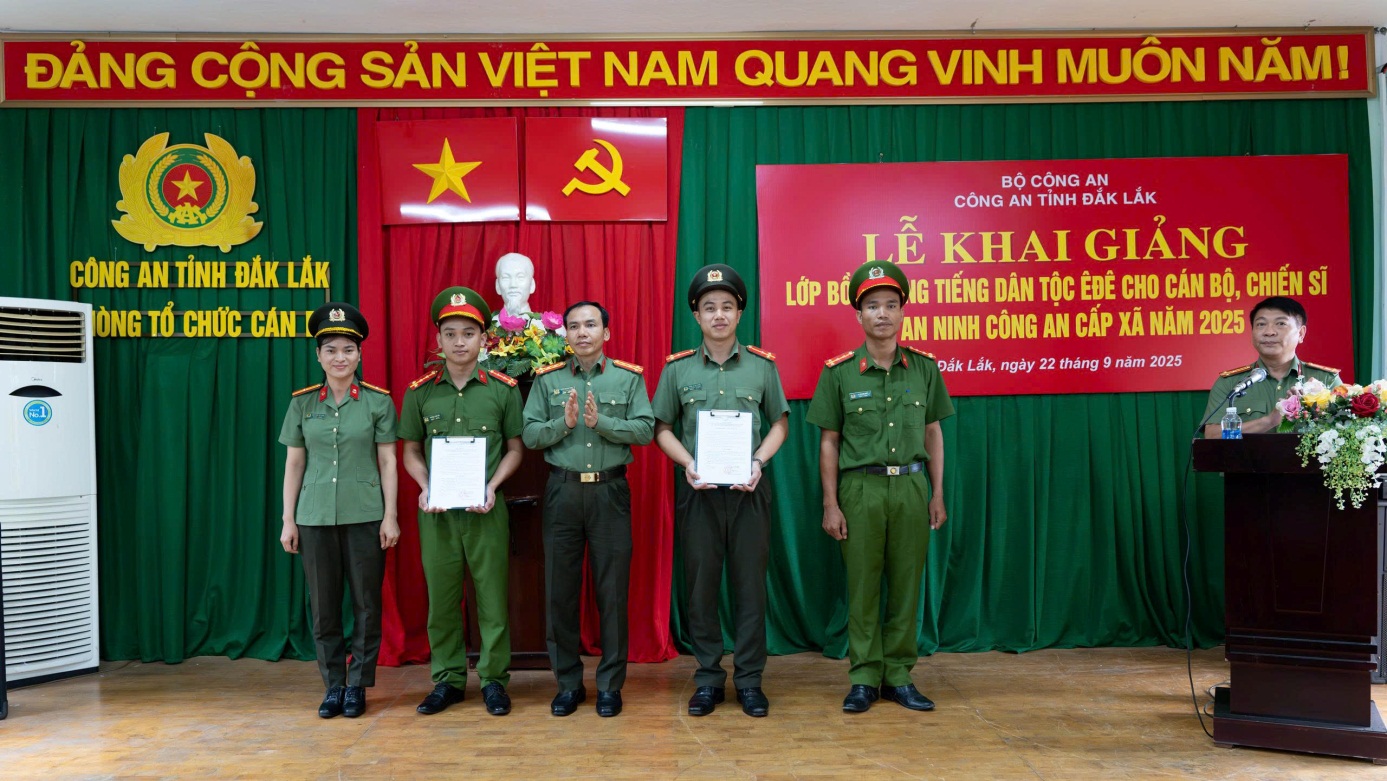 Sáng ngày 22 /9/2025, Công an tỉnh Đắk Lắk phối hợp Trung tâm Giáo dục nghề nghiệp - Giáo dục thường xuyên Buôn Ma Thuột tổ chức Lễ khai giảng lớp bồi dưỡng tiếng dân tộc Ê Đê cho 47 học viên là cán bộ, chiến sĩ Tổ An ninh Công an cấp xã. Tham dự buổi Lễ, về phía Công an tỉnh có đồng chí Đại tá Trần Quang Hiếu, Phó Bí thư Đảng ủy - Phó Giám đốc Công an tỉnh và đại diện lãnh đạo một số Phòng nghiệp vụ thuộc Công an tỉnh. Về phía Trung tâm Giáo dục nghề nghiệp - Giáo dục thường xuyên Buôn Ma Thuột có đồng chí Hà Ngọc Anh – Giám đốc trung tâm và giáo viên thuộc Trung tâm tham gia giảng dạy lớp bồi dưỡng.