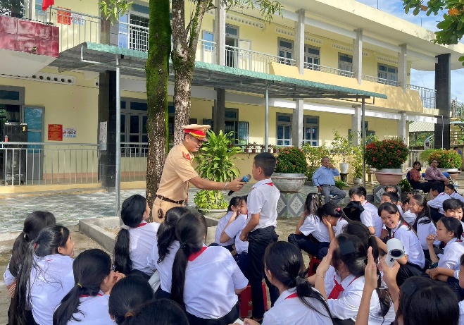 Đặc biệt, chương trình được tổ chức sinh động, hấp dẫn thông qua hình thức hỏi – đáp, giao lưu và xử lý tình huống thực tế. Các em học sinh hào hứng tham gia trả lời câu hỏi, nhận quà lưu niệm, đồng thời được hướng dẫn nhận biết các biển báo giao thông và cách tự bảo vệ bản thân khi tham gia giao thông. Nhiều tình huống gần gũi, thực tế được đặt ra giúp các em dễ hiểu, dễ nhớ, từ đó hình thành ý thức và thói quen đúng đắn khi tham gia giao thông.