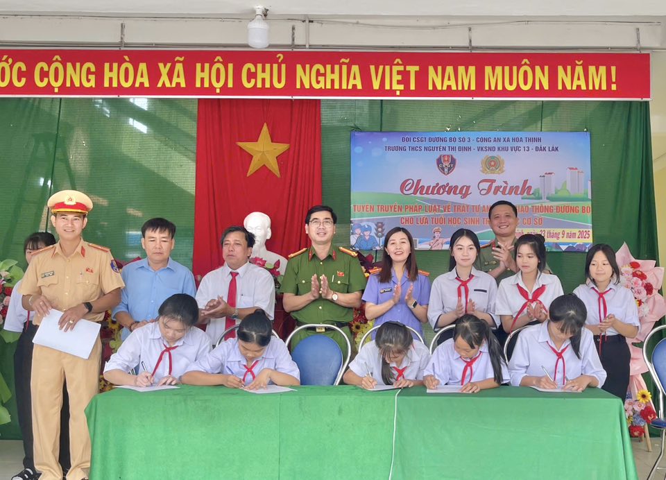 Hưởng ứng Tháng An toàn giao thông năm 2025, sáng ngày 24/9, Công an xã Hòa Thịnh phối hợp với Đội Cảnh sát giao thông đường bộ số 3 (Phòng Cảnh sát giao thông, Công an tỉnh Đắk Lắk), Viện Kiểm sát nhân dân Khu vực 13 và Trường THCS Nguyễn Thị Định tổ chức chương trình tuyên truyền pháp luật về trật tự an toàn giao thông (ATGT) cho 66 cán bộ, giáo viên cùng 1.022 học sinh của nhà trường.