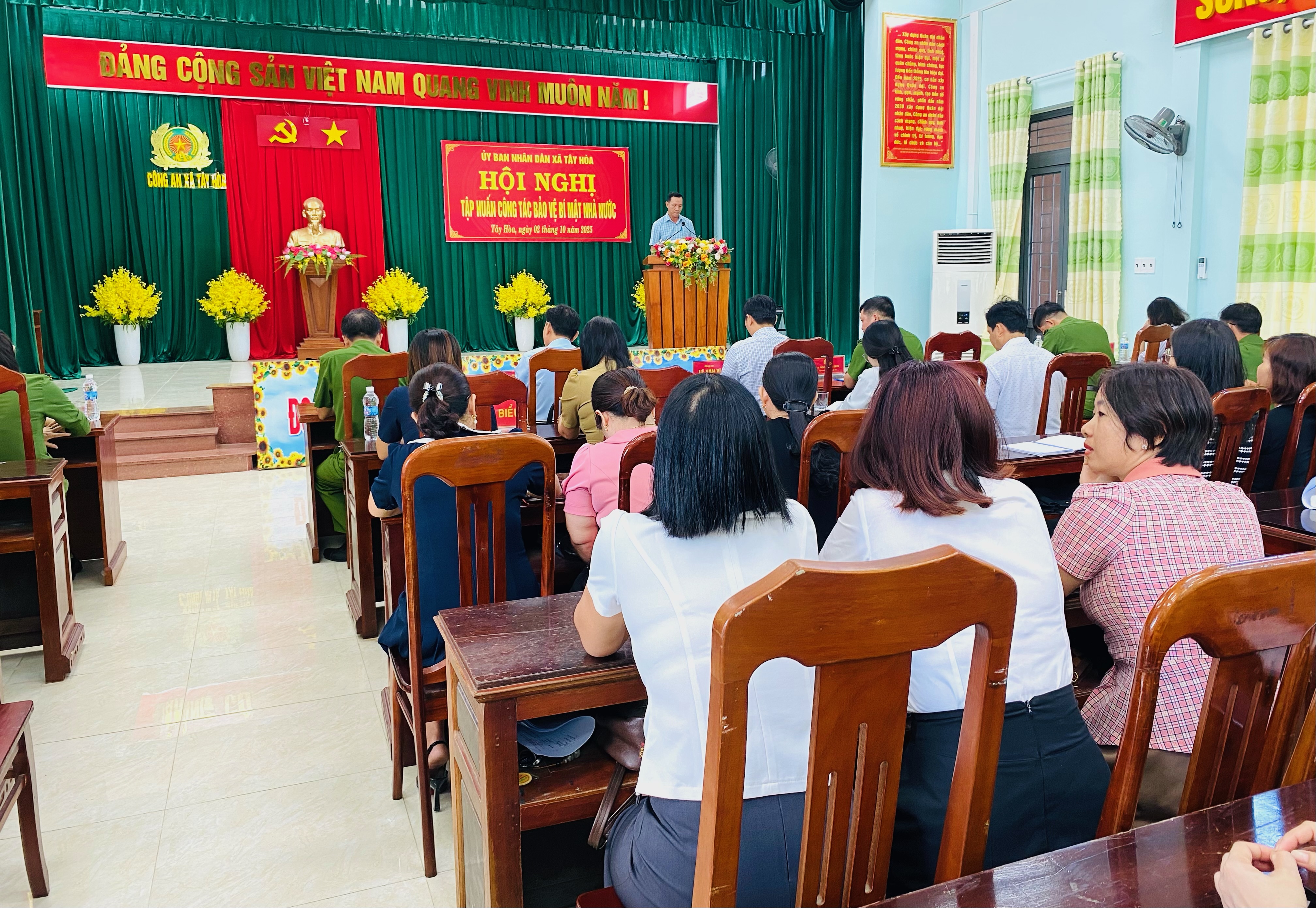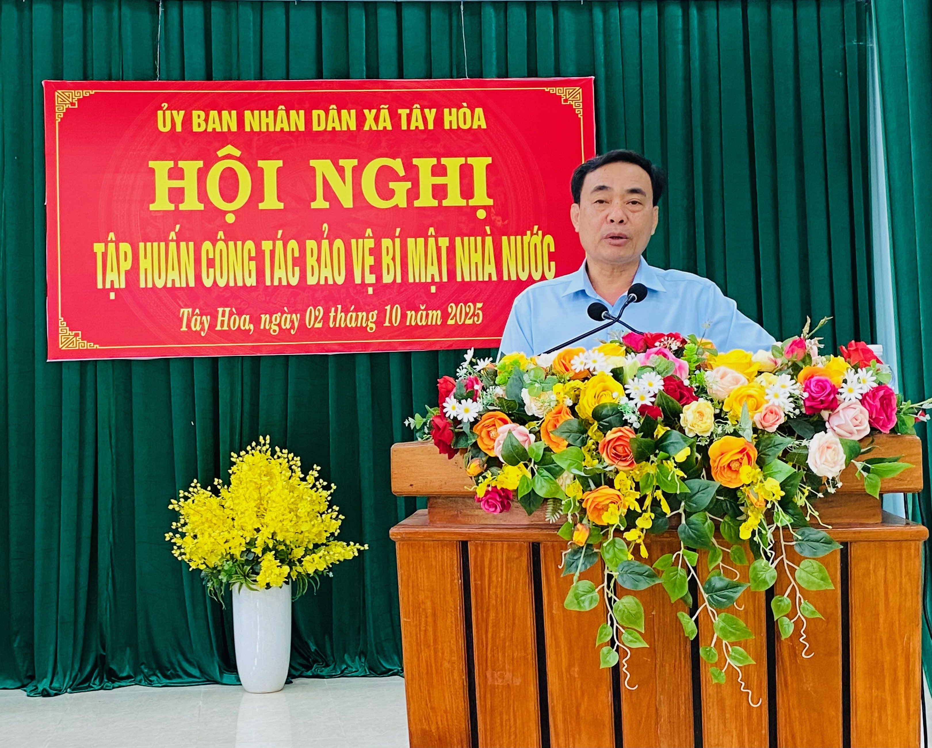 Phát biểu tại hội nghị, đồng chí Lê Văn Mười, Phó Bí thư Đảng ủy, Chủ tịch UBND xã Tây Hòa nhấn mạnh: “Bảo vệ BMNN là một trong những nội dung quan trọng trong công tác bảo vệ an ninh quốc gia, do đó việc tổ chức hội nghị tập huấn là hết sức cần thiết và có ý nghĩa quan trọng giúp cho các cơ quan, đơn vị nắm vững các quy định pháp luật để vận dụng có hiệu quả vào thực tiễn công tác, chủ động trong phòng ngừa, khắc phục sơ hở, thiếu sót, không để xảy ra vi phạm làm lộ, mất BMNN”.