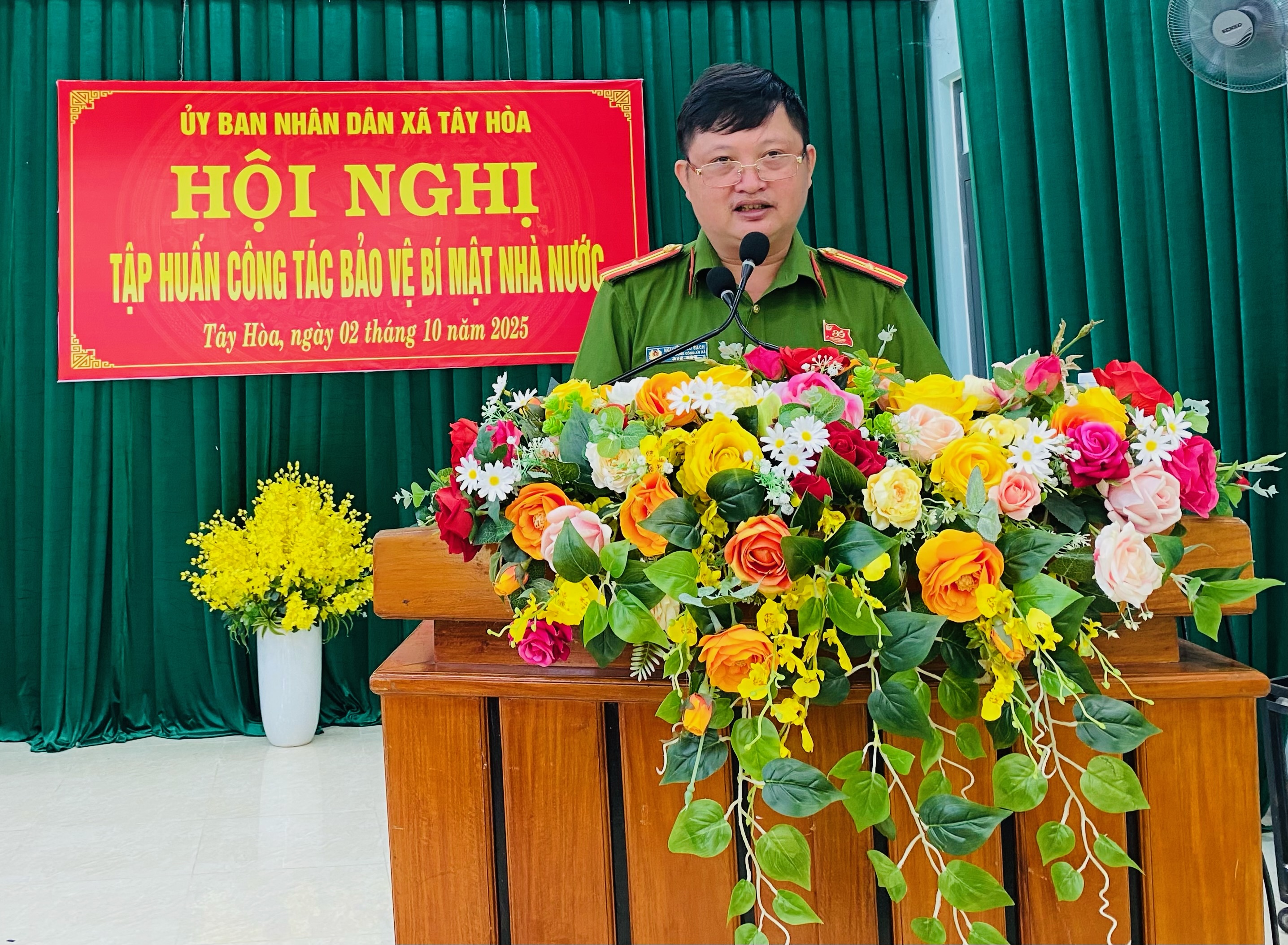 Ngày 02/10/2025, lực lượng Công an xã Tây Hòa đã tham mưu Ủy ban nhân dân xã tổ chức thành công Hội nghị tập huấn công tác bảo vệ BMNN cho gần 70 cán bộ là lãnh đạo chủ chốt và cán bộ thực hiện công tác bảo vệ BMNN tại các cơ quan, đơn vị trên địa bàn xã Tây Hòa.