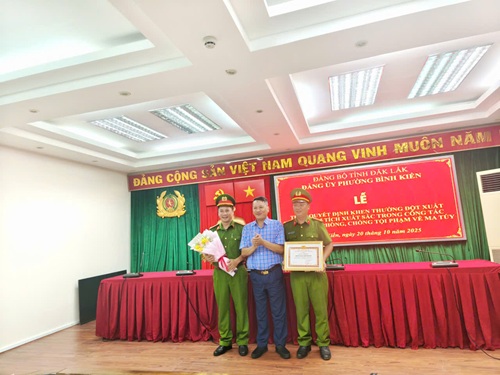 Chiều ngày 20/10/2025, Thường trực Đảng ủy phường Bình Kiến tổ chức trao thưởng đột xuất cho tập thể Đảng bộ Công an phường và 02 cán bộ thuộc Công an phường Bình Kiến vì có thành tích xuất sắc trong công tác đấu tranh, phòng, chống tội phạm về ma túy trên địa bàn. Đồng chí Nguyễn Lê Vi Phúc, Bí thư Đảng ủy, Chủ tịch HĐND phường Bình Kiến dự, chỉ đạo và trao thưởng.
