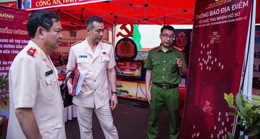Thiếu tướng Phan Thanh Tám - Giám đốc Công an tỉnh dự gian hàng sản phẩm công nghệ số của Phòng Cảnh sát QLHC về TTXH
