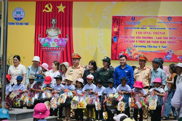 Tiếp theo đó, sáng ngày 04/10/2025, tại trường Tiểu học Y Nuê, phường Buôn Hồ, tỉnh Đắk Lắk, Phòng Cảnh sát cơ động phối hợp với Tổ Cảnh sát giao thông Buôn Hồ tổ chức Chương trình “Trung thu yêu thương - Lan toả niềm vui, bồi đắp ý thức an toàn giao thông”. Tại đây, các em học sinh được tuyên truyền về Luật Giao thông đường bộ và kỹ năng tham gia giao thông an toàn như: đội mũ bảo hiểm đúng cách, đi bộ qua đường an toàn, tuân thủ tín hiệu đèn giao thông và không vui đùa dưới lòng đường; các em được hoà mình vào những màn múa lân sôi động và được trao, tặng 300 suất quà (gồm: ba lô, bánh kẹo, lồng đèn) cho 300 em học sinh (tổng chi phí hoạt động khoảng 95 triệu đồng).