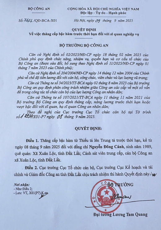 Theo đó, Bộ trưởng Lương Tam Quang đã ký Quyết định truy thăng cấp bậc hàm từ Thiếu tá lên Trung tá trước thời hạn, kể từ ngày 08/9/2025 đối với đồng chí Nguyễn Đông Cánh (sinh năm 1989), quê quán: xã Xuân Lộc, tỉnh Đắk Lắk; Cảnh sát viên Trung cấp, cán bộ Công an xã Xuân Lộc, tỉnh Đắk Lắk.