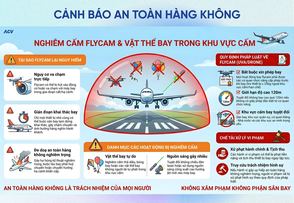 Thời gian gần đây, tại các sân bay liên tiếp xảy ra nhiều vụ việc thả diều, chiếu tia laser, sử dụng thiết bị bay không người lái xâm nhập khu vực cấm, gây mất an toàn hàng không, buộc nhiều chuyến bay phải chuyển hướng hoặc chậm giờ dây chuyền. Điển hình, trong dịp Tết Bính Ngọ 2026, tại Cảng hàng không quốc tế Đà Nẵng đã ghi nhận 54 chuyến bay bị ảnh hưởng do các thiết bị bay không người lái vi phạm vùng cấm bay.