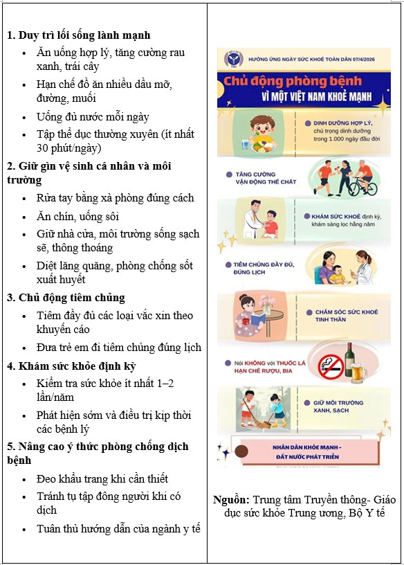 “Chủ động phòng bệnh” không chỉ là trách nhiệm của ngành y tế mà còn là nghĩa vụ của mỗi cá nhân, gia đình và toàn xã hội. Khi mỗi người dân có ý thức bảo vệ sức khỏe của mình, chúng ta sẽ cùng nhau xây dựng một cộng đồng khỏe mạnh, năng động và phát triển bền vững.