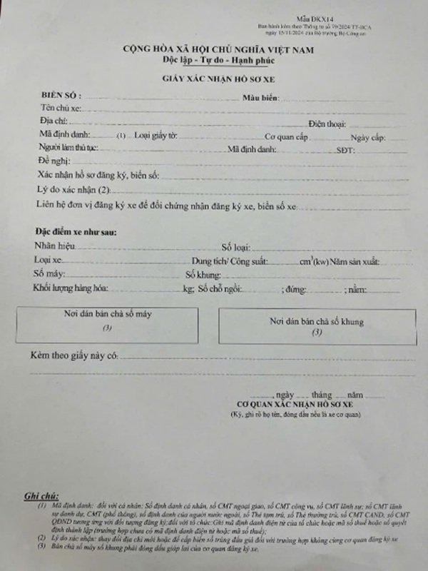 Mẫu ĐKX14 Giấy xác nhận hồ sơ xe (Ban hành kèm theo Thông tư 79/2024/TT-BCA ngày 15/11/2024 của Bộ Công an)