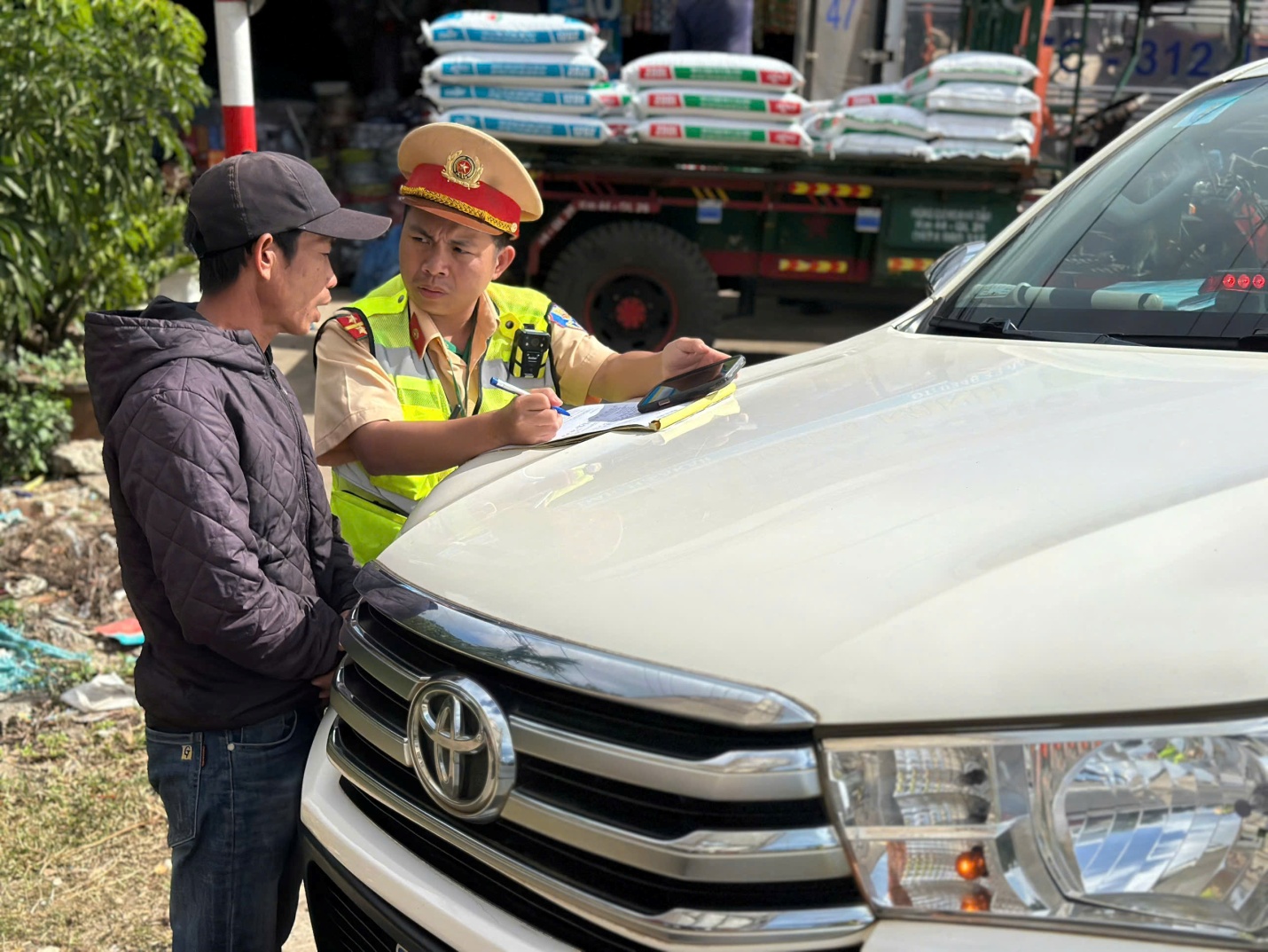 Lực lượng CSGT lập biên bản vi phạm hành chính lái xe.