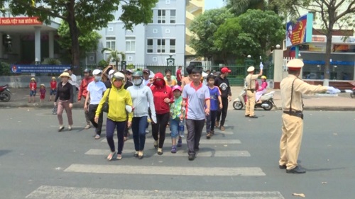 CSGT điều tiết giao thông giúp người đi bộ qua đường an toàn
