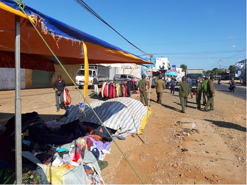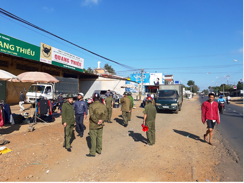 Lực lượng Công an xã tiến hành xử lý các hành vi buôn bán, lấn chiếm hành lang an toàn đường bộ tại khu vực chợ Trung Hoà, xã Ea Tiêu và Ea Ktur.