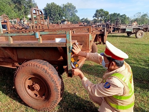 Lực lượng Cảnh sát giao thông, trật tự Công an huyện dán decan phản quang trên xe công nông, máy kéo cho người dân