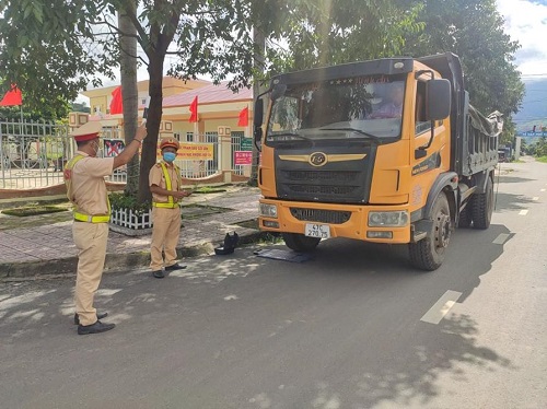 Lực lượng CSGT Công an huyện Krông Bông kiểm tra, xử lý xe ô tô chở hàng quá tải trọng