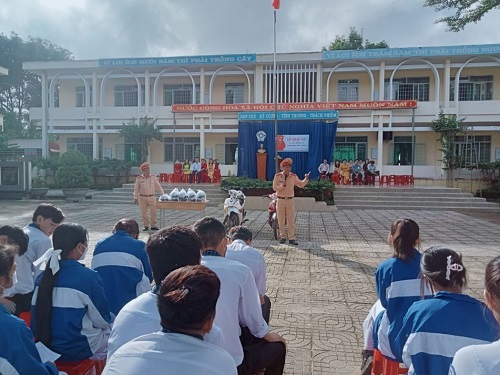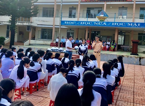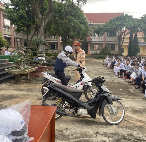 Cán bộ Đội Cảnh sát giao thông, trật tự tuyên truyền về Luật An toàn giao thông tại trường THPT Krông Ana, thị trấn Buôn Trấp, với 1.328 cán bộ, giáo viên và học sinh tham dự