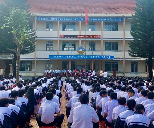 Tuyên truyền về Luật An toàn giao thông trong buổi Chào cờ đầu tuần tại trường THPT Hùng Vương, thị trấn Buôn Trấp, với 1.002 cán bộ, giáo viên và học sinh tham dự