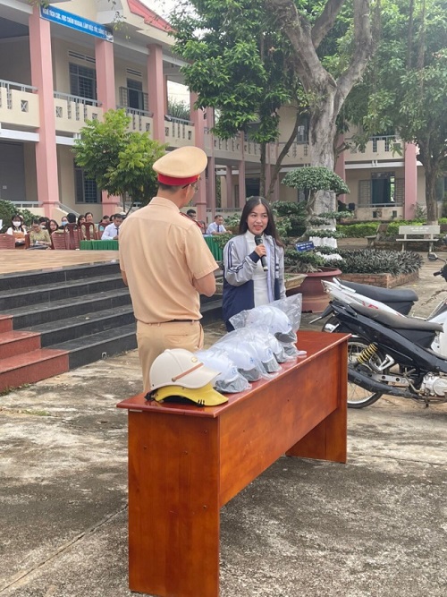 Nhân dịp này, Ban an toàn giao thông huyện đã trao tặng mũ bảo hiểm cho các em học sinh thông qua hoạt động hỏi đáp kiến thức về luật giao thông đường bộ; phát tờ rơi tuyên truyền luật Giao thông đường bộ cho học sinh nhà trường.