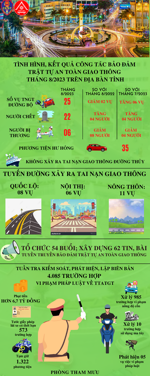 [Infographic]: Tình hình, kết quả công tác bảo đảm trật tự an toàn giao thông tháng 8 năm 2023 trên địa bàn tỉnh