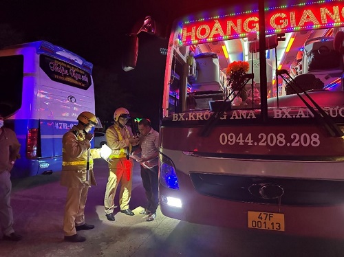 Lực lượng Cảnh sát giao thông Công an huyện Krông Ana ra quân thực hiện đợt cao điểm kiểm tra nồng độ cồn với tất cả tài xe lái xe tại bến xe trên địa bàn huyện trước khi xuất bến.