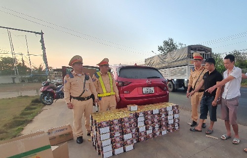 Theo đó, vào khoảng 15 giờ 45 phút ngày 19/3, một tổ công tác của Trạm CSGT Krông Búk, thuộc phòng CSGT Công an tỉnh Đắk Lắk đang làm nhiệm vụ tuần tra, kiểm soát giao thông trên đường Hồ Chí Minh đoạn qua xã Cuôr Đăng, huyện Cư M’gar, tỉnh Đắk Lắk thì phát hiện chiếc xe ô tô con mang BKS: 37A-809.69 đang lưu thông theo hướng Gia Lai đi TP.HCM có nhiều biểu hiện nghi vấn nên đã ra hiệu lệnh dừng phương tiện để kiểm tra. Tài xế điều khiển xe là Phan Văn Tân (36 tuổi) trú tại xã Nghĩa Đồng, huyện Tân Kỳ, tỉnh Nghệ An. Trên xe chở theo Bùi Văn Thế (31 tuổi) trú tại xã Bắc Sơn, huyện Đô Lương, tỉnh Nghệ An. Qua kiểm tra trên xe, tổ công tác phát hiện có 27 thùng carton mang nhãn hiệu sữa Vinamil Ông Thọ. Tiếp tục kiểm tra các thùng sữa này, lực lượng CSGT phát hiện một số lượng rất lớn pháo hoa nổ được nguỵ trang bên trong.