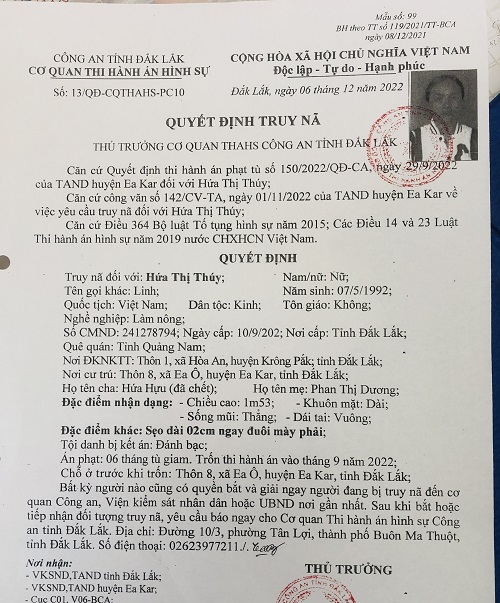 Với hành vi tổ chức đánh đánh bạc, Hứa Thị Thúy và 4 bị cáo khác đã bị Tòa án Nhân dân tỉnh Đắk Lắk tuyên phạt mỗi bị cáo từ 6 đến 10 tháng tù giam. Tuy nhiên, đến ngày chấp hành án bị cáo Thúy đã bỏ trốn khỏi địa phương và lẩn trốn tại hai tỉnh Lâm Đồng và Gia Lai. Vì vậy, Cơ quan Thi hành án hình sự Công an tỉnh Đắk Lắk đã bị ra quyết định truy nã đối tượng.