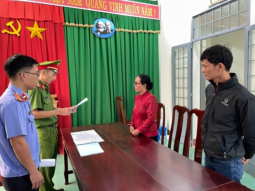 Cơ quan CSĐT Công an huyện Ea H’leo ra quyết định khởi tố bị can, bắt tạm giam Đoàn Thị Lam (áo đỏ) để điều tra về hành vi lừa đảo chiếm đoạt tài sản