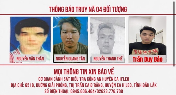 4. Truy nã đối tượng Trần Duy Bảo (sinh năm 16/01/2007, nơi thường trú: Thôn 4, xã Ea Khal, huyện Ea H'Leo, tỉnh Đắk Lắk) về tội Cố ý gây thương tích