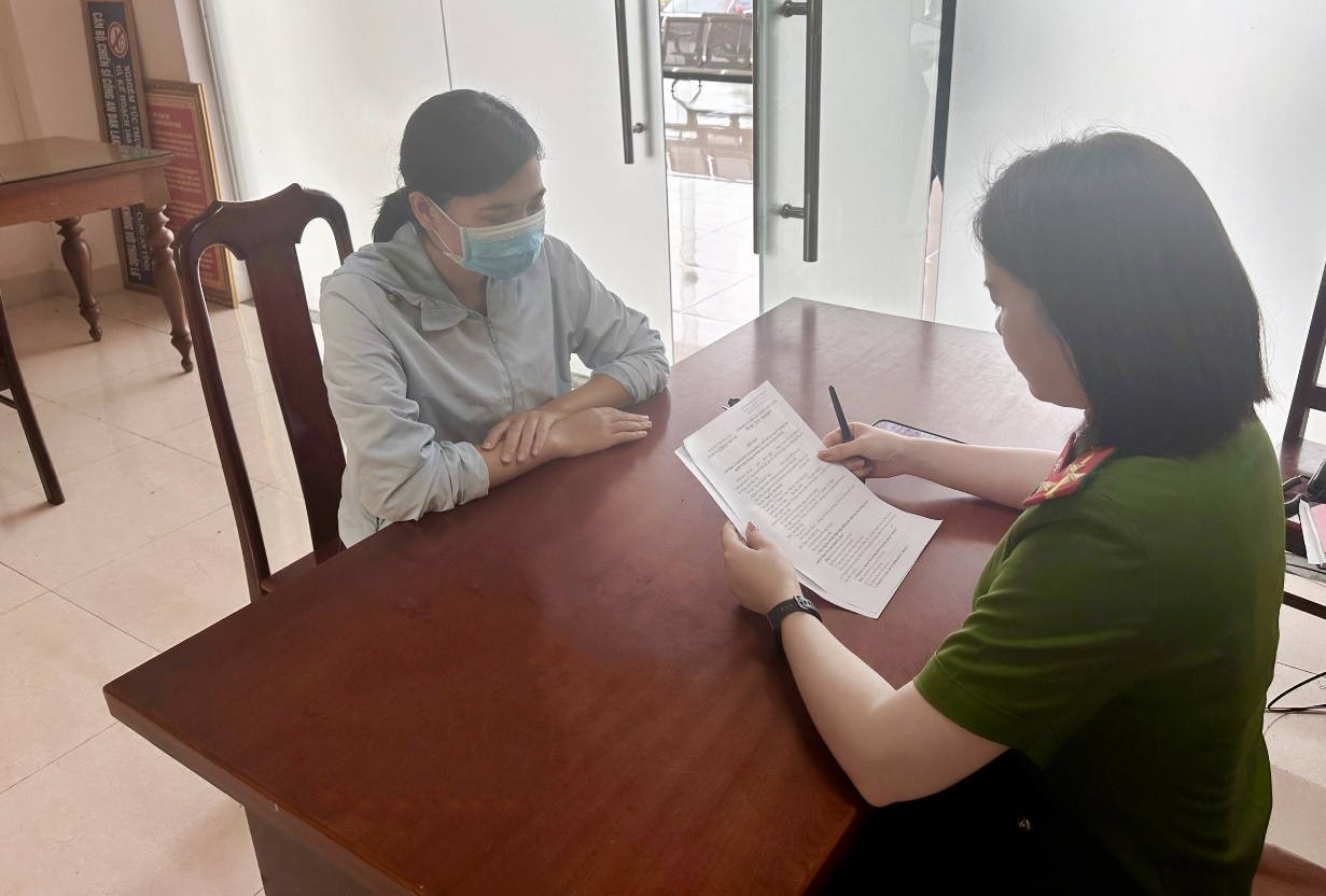 Bị can Nguyễn Thị Huyền (bên trái ảnh) tại Cơ quan Công an