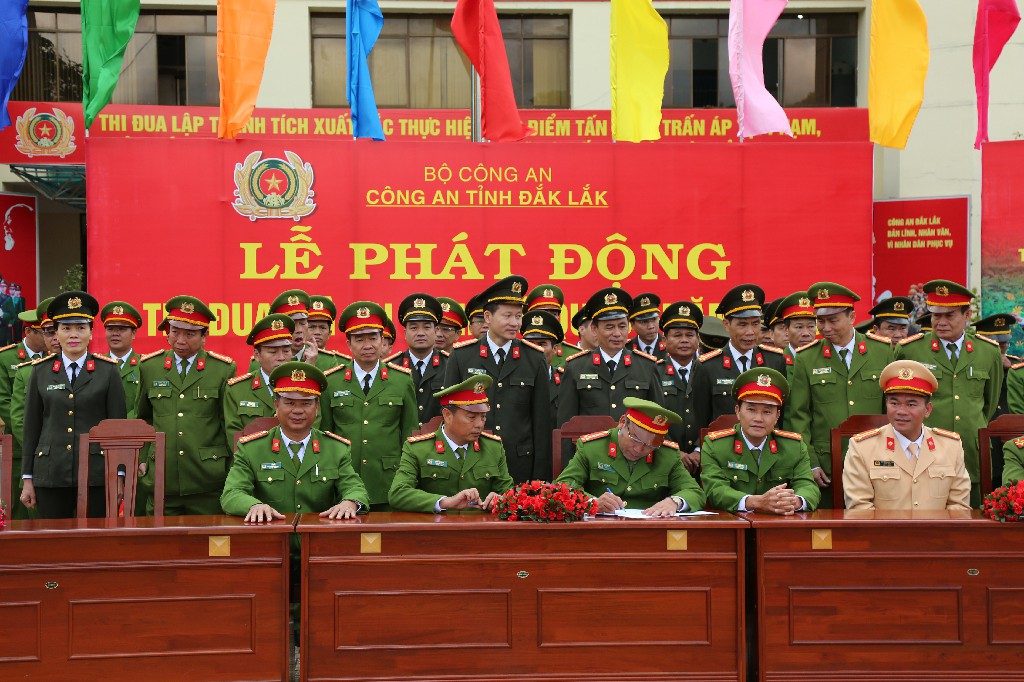 Tiếp đó, Công an tỉnh Đắk Lắk đã tổ chức phát động và ký kết giao ước thi đua "Vì an ninh Tổ quốc" năm 2019. Các khối thi đua từ Công an tỉnh đến 15 huyện, thành phố, thị xã đã cùng nhau ký kết để thực hiện tốt mục tiêu đề ra trong 2019 là đột phá, nâng cao hơn nữa chất lượng hiệu quả các mặt công tác, hoàn thành xuất sắc những nhiệm vụ được giao. Trong đó, đặc biệt coi trọng việc xây dựng Đảng, xây dựng lực lượng Công an Đắk Lắk TSVM; tập trung tham mưu cho cấp ủy, chính quyền các cấp chỉ đạo cả hệ thống chính trị vào cuộc quyết liệt hơn nữa trong lĩnh vực bảo vệ AN-TT. CBCS Công an trong tỉnh làm nòng cốt, đi đầu, phối hợp chặt chẽ với các ban, ngành, đoàn thể xây dựng phát triển mạnh mẽ phong trào toàn dân BVANTQ; bảo vệ tốt an ninh buôn làng; tổ chức phòng ngừa, đấu tranh, xử lý hiệu quả với các loại tội phạm, nhất là một số tội phạm mới nổi, các băng ổ nhóm côn đồ nguy hiểm; tội phạm kinh tế, phá rừng; tiếp tục triệt xóa các điểm đen ma túy, tệ nạn xã hội, "tín dụng đen", "bảo kê thu mua nông sản" v.v; chú trọng đẩy mạnh cải cách hành chính, tăng cường hướng về cơ sở, kiềm giảm sâu các loại tội phạm, góp phần đảm bảo môi trường xã hội yên bình để tỉnh Đắk Lắk phát triển kinh tế, xã hội mạnh mẽ và bền vững./.