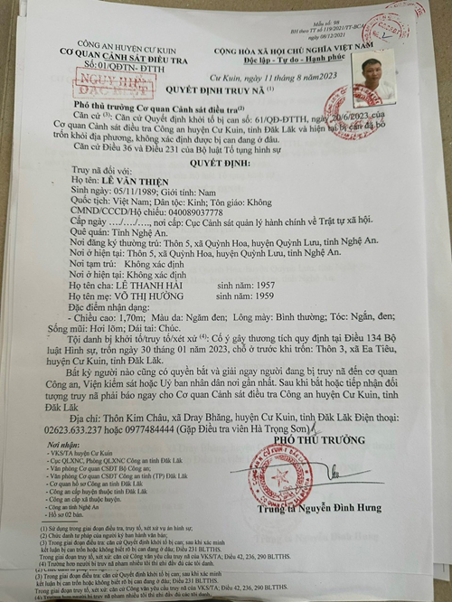 Vừa qua, Công an huyện Cư Kuin phối hợp cùng Phòng Cảnh sát hình sự Công an tỉnh Đắk Lắk đã truy bắt thành công đối tượng truy nã đặc biệt nguy hiểm Lê Văn Thiện, sinh ngày 05/11/1989, cư trú tại thôn 5, xã Quỳnh Hoa, huyện Quỳnh Lưu, Nghệ An (theo Quyết định truy nã số 01 ngày 11/8/2023 của Cơ quan Cảnh sát điều tra Công an huyện Cư Kuin).