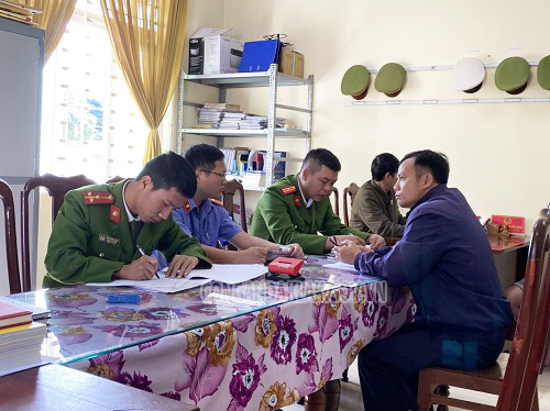 Cơ quan cảnh sát điều tra Công an huyện Krông Bông tống đạt Quyết định khởi tố bị can đối với Nguyễn Văn Trung (mặc quần áo xanh đen, ngồi ngoài cùng bên phải)