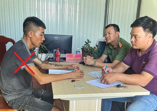 Đ/c Trung tá Hồ Phi Nam – Phó Trưởng Công an huyện làm việc với đối tượng Nguyễn Văn Hợp (mặc áo đen)