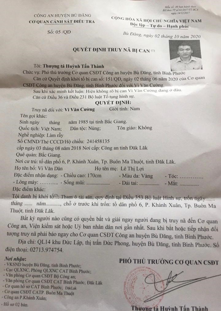Quyết định truy nã do Công an huyện Bù Đăng, tỉnh Bình Phước ban hành