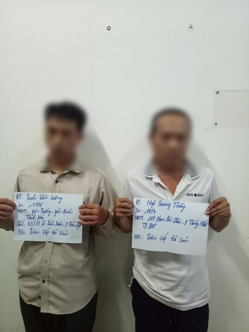 Ngay sau khi nhận được tin báo, Công an phường Tân Tiến đã nhanh chóng triển khai lực lượng, tập trung điều tra, xác minh vụ việc. Qua điều tra, Công an phường Tân Tiến xác định 02 đối tượng thực hiện hành vi trộm cắp tài sản là Ngô Quang Thắng (sinh năm 1974, hộ khẩu thường trú tại số nhà 178, đường Phan Bội Châu, phường Thống Nhất, thành phố Buôn Ma Thuột) và Trịnh Văn Lượng (sinh năm 1975, hộ khẩu thường trú tại số nhà 43/13, đường Lê Minh Xuân, phường Tân Lập, thành phố Buôn Ma Thuột). Tại Cơ quan Công an, 02 đối tượng đã thừa nhận hành vi phạm tội.