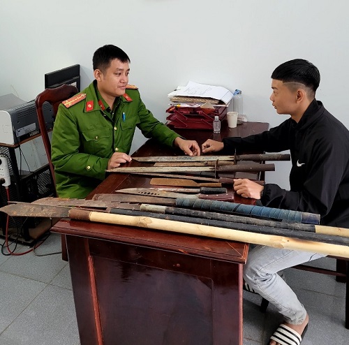 Cán bộ Công an phường tiếp nhận dao, mã tấu do công dân đến giao nộp