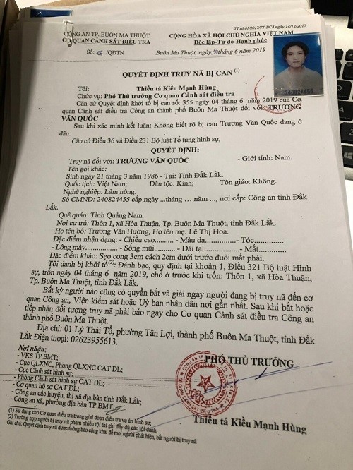 Quyết định truy nã bị can Trương Văn Quốc