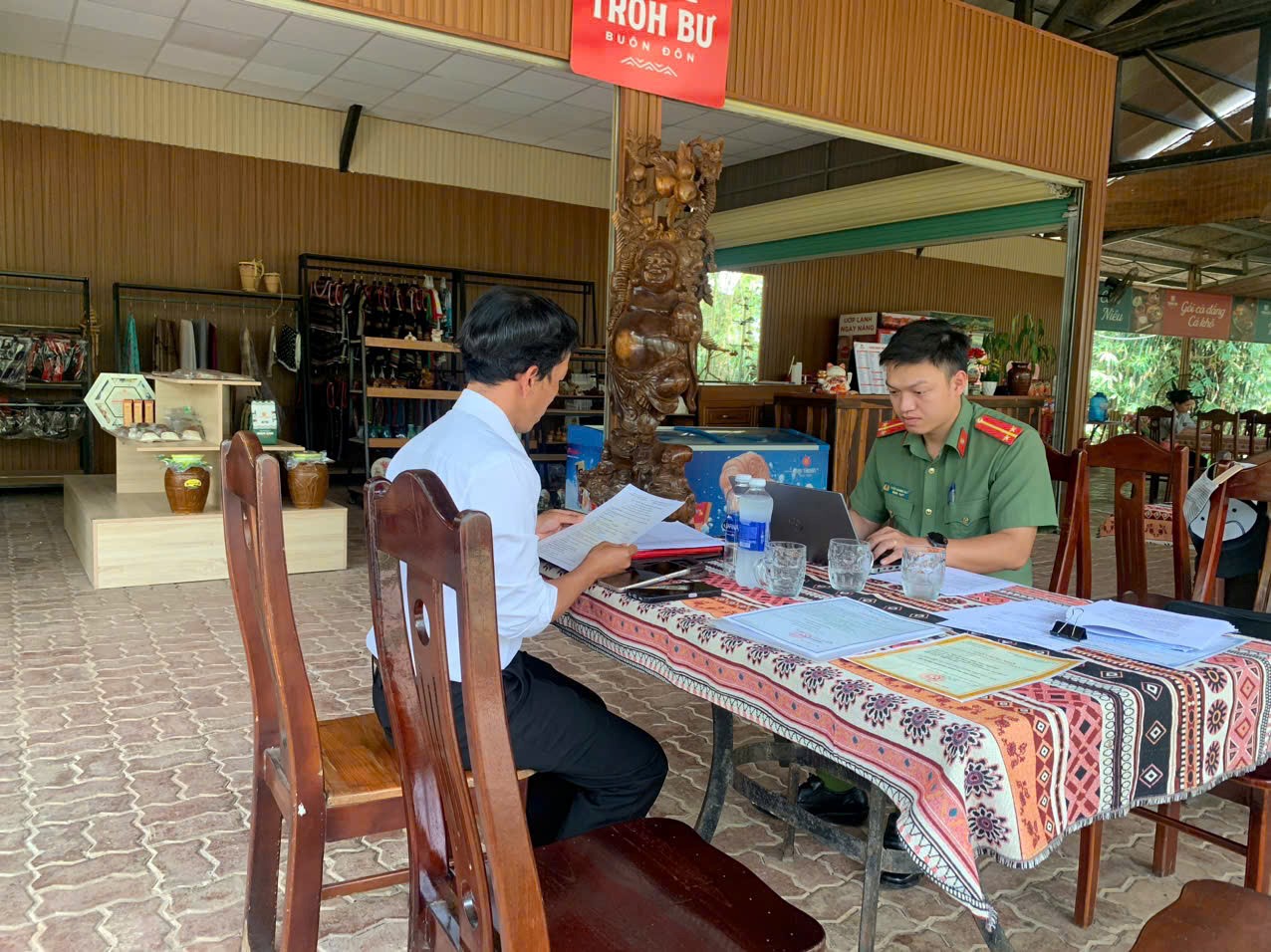 Cán bộ Công an làm việc với đại diện cơ sở kinh doanh dịch vụ du lịch Troh Bư (huyện Buôn Đôn)