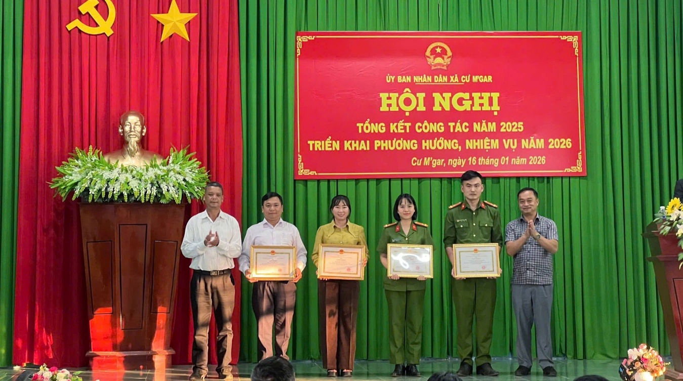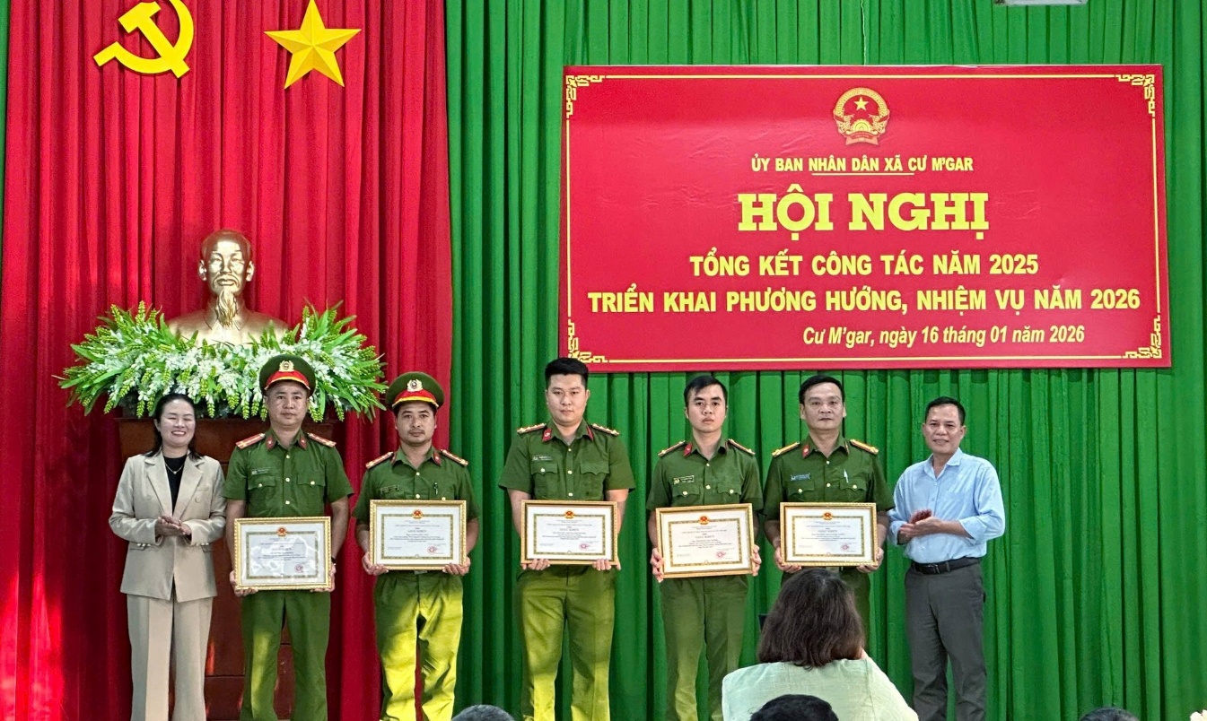 Theo đó, trong đợt ra quân cao điểm tấn áp tội phạm bảo đảm ANTT các sự kiện lớn năm 2026, Công an xã đã phát hiện, xử lý 04 vụ, 12 đối tượng phạm tội về ma túy; 01 vụ, 01 đối tượng có hành vi buôn bán hàng cấm (50 bao thuốc lá điếu nhập lậu); 01 vụ, 06 đối tượng đánh bạc trái phép. Với kết quả đạt được, Chủ tịch UBND xã Cư M’gar quyết định khen thưởng đột xuất cho 1 tập thể và 5 cá nhân vì đã có thành tích xuất sắc trong thời gian vừa qua.