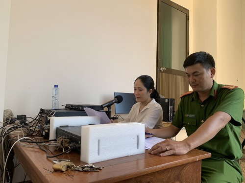 Cán bộ Công an phường và cán bộ văn hóa thông tin tổ chức tuyên truyền qua hệ thống loa phát thanh