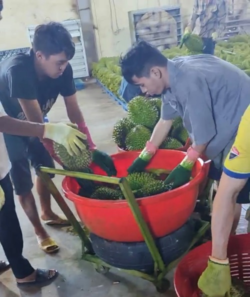 Công nhân đang ngâm, nhúng sầu riêng vào thau hoá chất