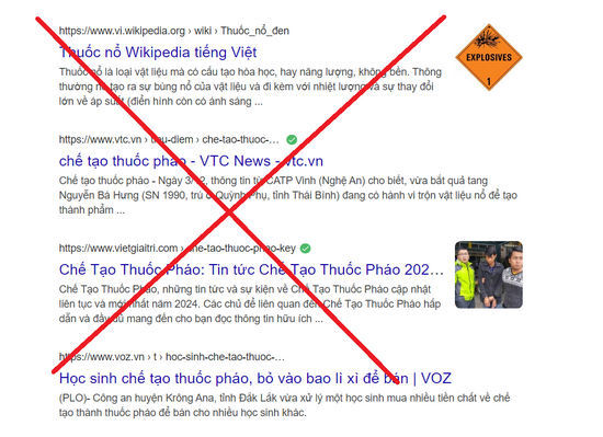 Một số kết quả tìm kiếm trên mạng internet về cách chế tạo pháo, thuốc nổ (Nguồn internet)