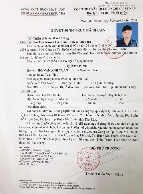 Cơ quan thi hành án hình sự, Công an tỉnh Đắk Lắk thông báo truy nã đối tượng