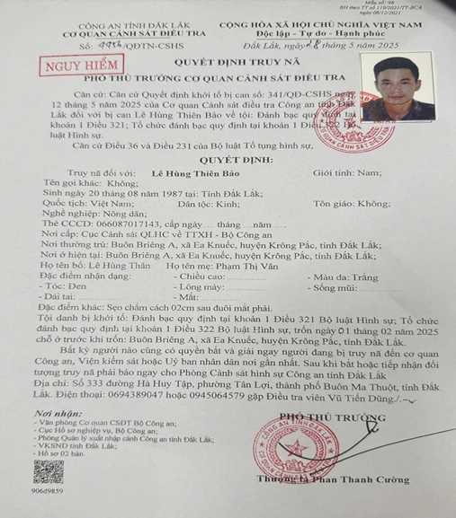 Tội danh bị khởi tố: Đánh bạc, quy định tại khoản 1 Điều 321 Bộ luật hình sự; Tổ chức đánh bạc quy định tại khoản 1 Điều 322 Bộ luật hình sự, trốn ngày 01 tháng 02 năm 2025, chổ ở trước khi trốn: Buôn Briêng A, xã Ea Knuếc, huyện Krông Pắc, tỉnh Đắk Lắk.