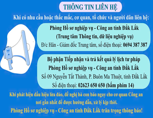 Để bảo vệ tài sản và thông tin cá nhân, người dân trên địa bàn tỉnh Đắk Lắk cần nâng cao cảnh giác, chỉ thực hiện yêu cầu cấp Phiếu lý lịch tư pháp qua các kênh chính thống như ứng dụng VNeID, Cổng Dịch vụ công quốc gia, trực tiếp tại Trung tâm phục vụ hành chính công hoặc gửi hồ sơ qua đường bưu chính đến cơ quan có thẩm quyền.